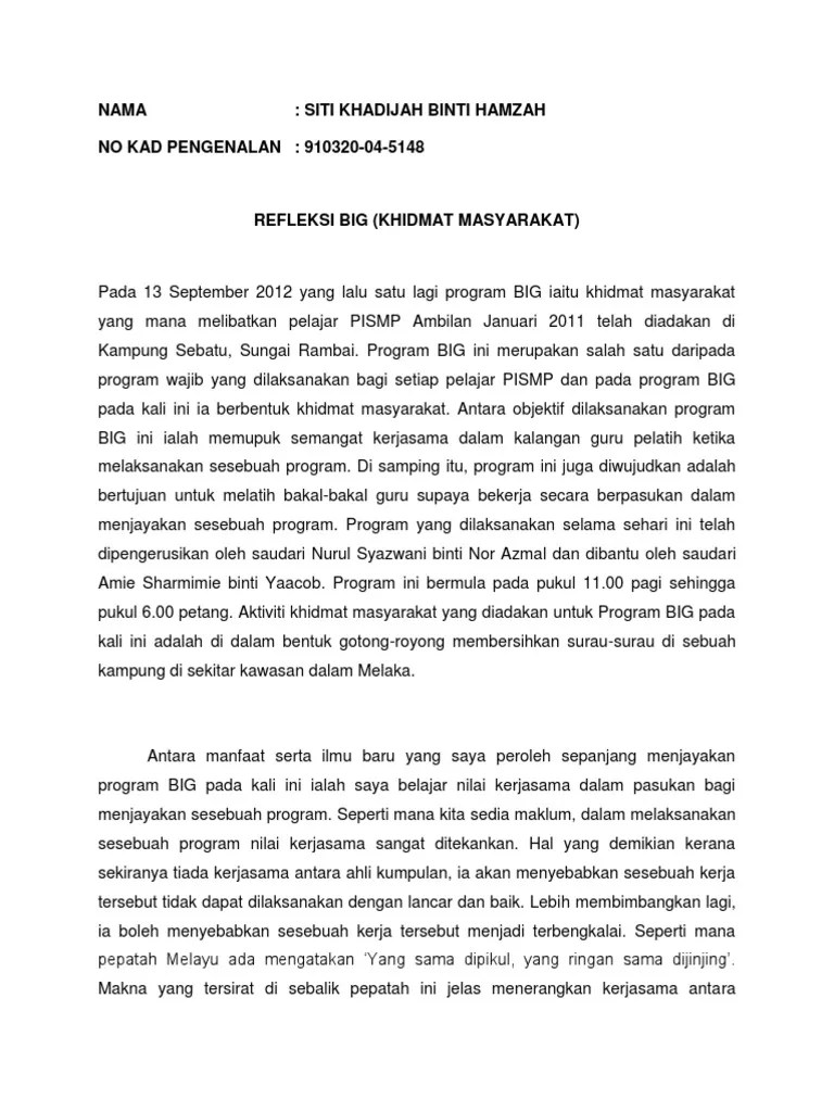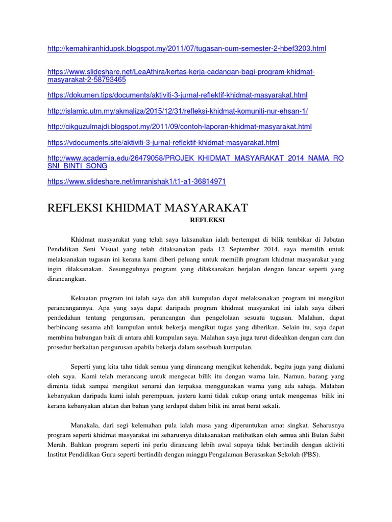 By azman bin perjalanan saya sepanjang pembelajaran di peringkat ijazah sarjana muda teknologi maklumat dan pengurusan di. Kurang lebihnya mohon maaf, jika dalam penulisan contoh laporan diatas kurang berkenan atau ada kesalahan bahasa maupun strukturmya, harap di. Contoh jurnal reflektif khidmat masyarakat. Komponen penilaian jumlah skor a b c d perancangan kerja amali refleksi laporan 10 20 5 5 jumlah 40 jadual kriteria penilaian khidmat masyarakat : Kertas kerja cadangan bagi program khidmat masyarakat di rumah anak anak yatim nurul ihsan (sg siput) 1.0 tujuan kertas kerja ini bertujuan untuk mendapatkan kelulusan (seminar dan.
