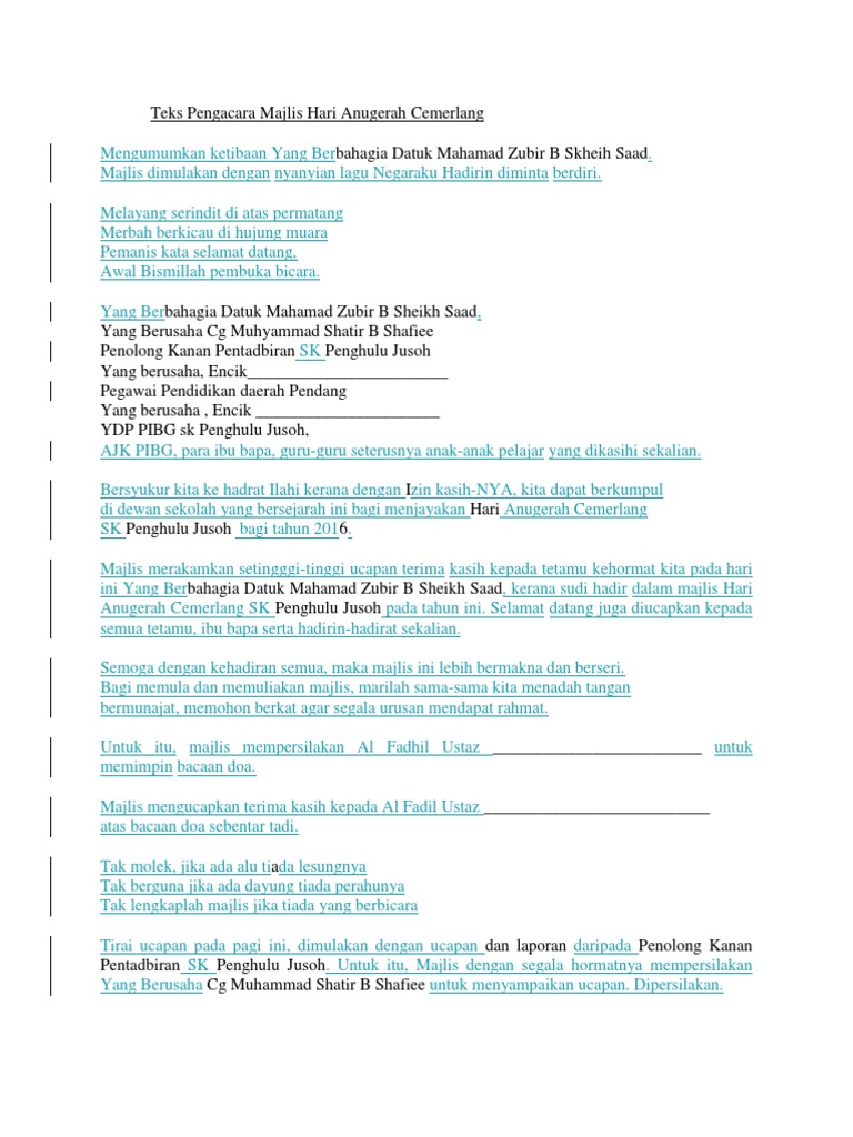 Justeru, adalah menjadi harapan kami warga pendidik agar ianya menjadi tonggak bagi memulakan anjakan paradigma dan pencetus revolusi dalam diri. Teks pengacara hari anugerah cemerlang akademik. Untuk menyampaikan anugerah kepada pelajar yang mendapat keputusn cemerlang. Tentatif program viewpengerusi memaklumkan kepada ajk protokol supaya menyediakan aturcara pentadbiran dan teks pengacara majlis bagi kegunaan pada hari kejadian. We are a sharing community.