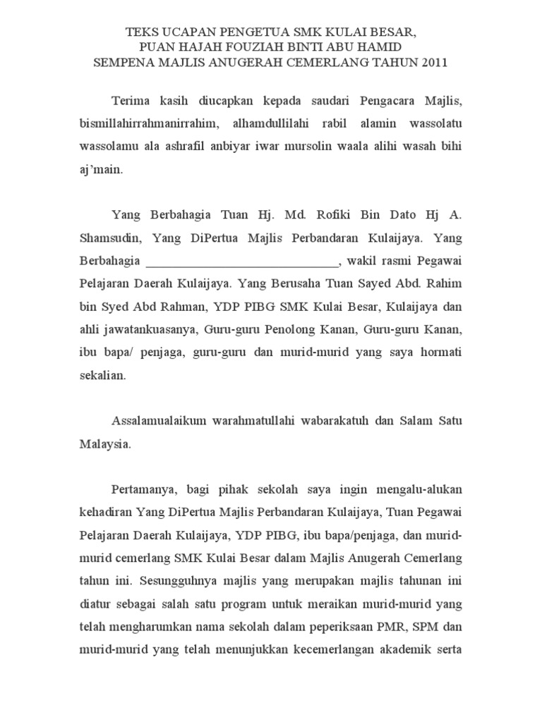 Contoh teks pengacara majlis / ucapan emcee majlis persaraan cikgu. Assalamualaikum w.b.t, salam sejahtera, salam 1 malaysia. Untuk menyampaikan anugerah kepada pelajar yang mendapat keputusn cemerlang. So please help us by uploading 1 new document or like us to download Membawakan dari auditorium seri perdana ,pertandingan pidato peringkat daerah jasin melaka bandaraya bersejarah.