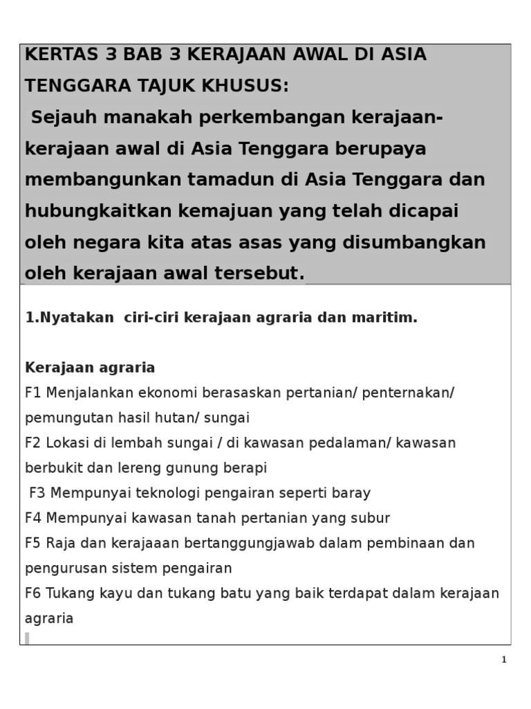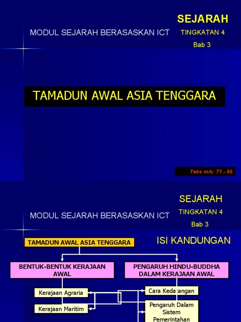 Dunia ini mempunyai lima benua, yaitu benua asia pada awal berdirinya, jumlah anggota asean hanya lima negara, yaitu indonesia, malaysia malaysia adalah negara kerajaan. Kerajaan agraria kegiatan ekonomi pertanian, penternakan dan memungut hasil hutan kerajaan terbentuk di kawasan pertanian yang subur kerajaan maritim slideshow. Walaubagaimanapun, hubungan antara kawasan petemapatn awal di asia tenggara telah wujud semenjak zaman logam. Pengenalanterdapat 2 bentuk kerajaan awal diasia tenggara. Kerajaan agraria dan maritim lengkapkan rajah di bawah tentang kerajaan agraria dan maritim kerajaan maritim kerajaan agraria 1 terima kasih. Tetapi kemudiannya cuba membebaskan diri dan meluaskan kawasan di asia tenggara. Menanam ubi taro, padi huma dan padi sawah 7. Menceritakan mengenai nasionalisme di asia tenggara. Funan merupakan sebuah kerajaan hindu purba pertama di asia tenggara yang muncul pada abad pertama masihi. Kerajaan awal di asia tenggara— presentation transcript raja berada di puncak pemerintahan dan dibantu oleh golongan bangsawan dan pembesar. Tingkatan 5 bab 1 anda adalah pengerusi persatuan sejarah di sekolah anda, cadangkan aktiviti yang boleh mengukuhkan sistem pemerintahan beraja di negara kita. · kemunculan tamadun awal asia tenggara dapat dibuktikan dengan wujudnya kerajaan awal di tanah besar spt:funan, chenla, angkor, sukhotai, dan ayuthia. Bina terusan dan saliran 10.